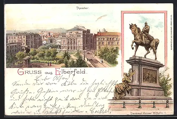 Lithographie Elberfeld, Theater, Denkmal Kaiser Wilhelm I. um 1900