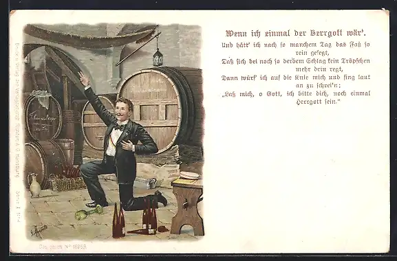 Lithographie Eleganter Herr auf Knien im Weinkeller