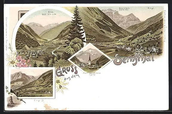 Lithographie Elm /Sernfthal, Engi II, Matt mit Kirche und Glärnisch