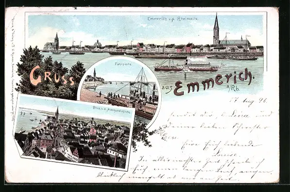 Lithographie Emmerich a. Rh., Teilansicht v. d. Rheinseite, Fährponte, Blick v. d. Aldegundiskirche