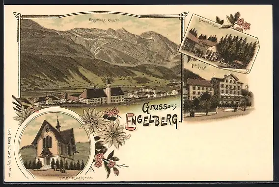 Lithographie Engelberg, Hotel Engel, Gasthof Eyenwäldchen, Protestantische Kirche