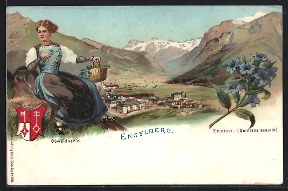 Lithographie Engelberg, Obwaldnerin in Tracht, Enzian, Wappen