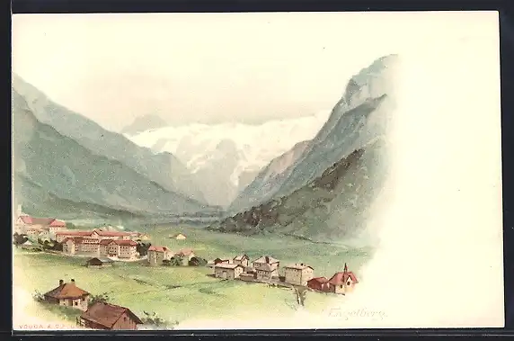 Lithographie Engelberg, Totalansicht mit schneebedecktem Berg