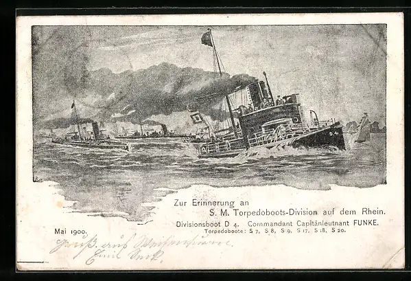 Lithographie Erinnerung an S. M. Torpedoboots-Division a.d. Rhein, Divisionsboot D 4, Kommandant Kapitänleutnant Funk