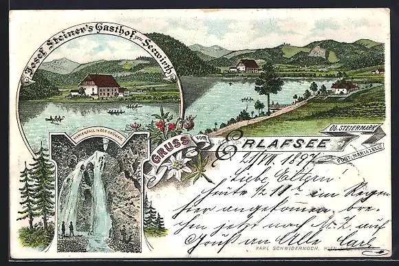 Lithographie Erlafsee, Josef Steiners Gasthof zum Seewirth, Marienfall in der Grünau