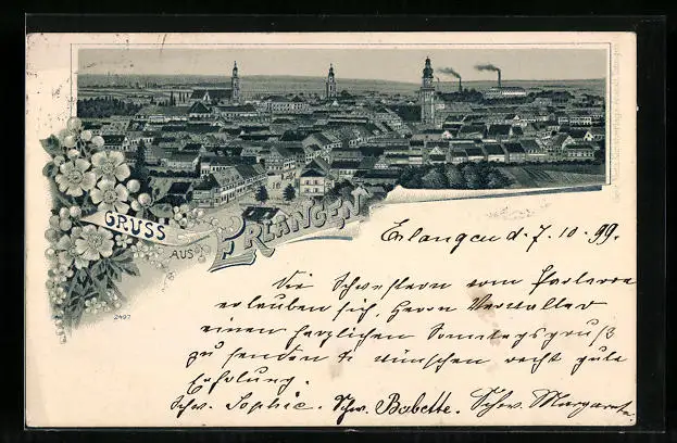 Lithographie Erlangen, Totalansicht aus der Vogelschau
