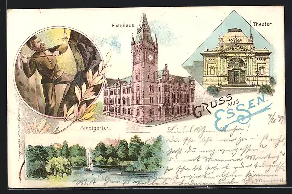 Lithographie Essen, Ansicht vom Rathaus, Theater, Stadtgarten