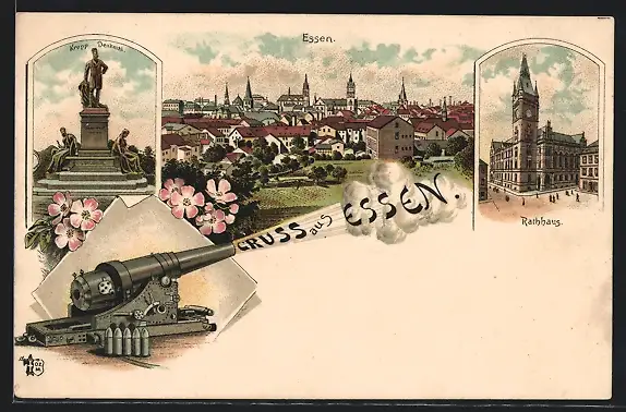 Lithographie Essen, Rathaus, Krupp-Denkmal, Kanone