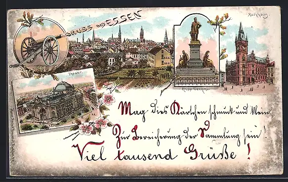 Lithographie Essen, Theater, Krupp-Denkmal, Rathhaus