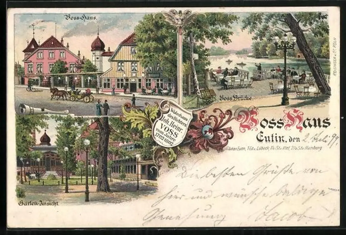Lithographie Eutin, Wohnhaus des Dichters Joh. Heinrich Voss, Voss-Brücke, Gartenansicht