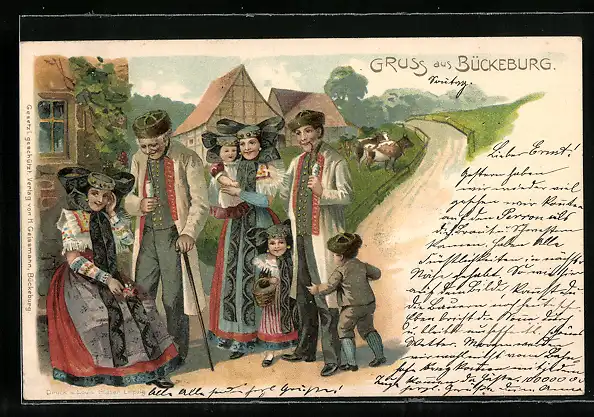 Lithographie Festlich gekleidet in Bückeburg, Tracht Schaumburg-Lippe