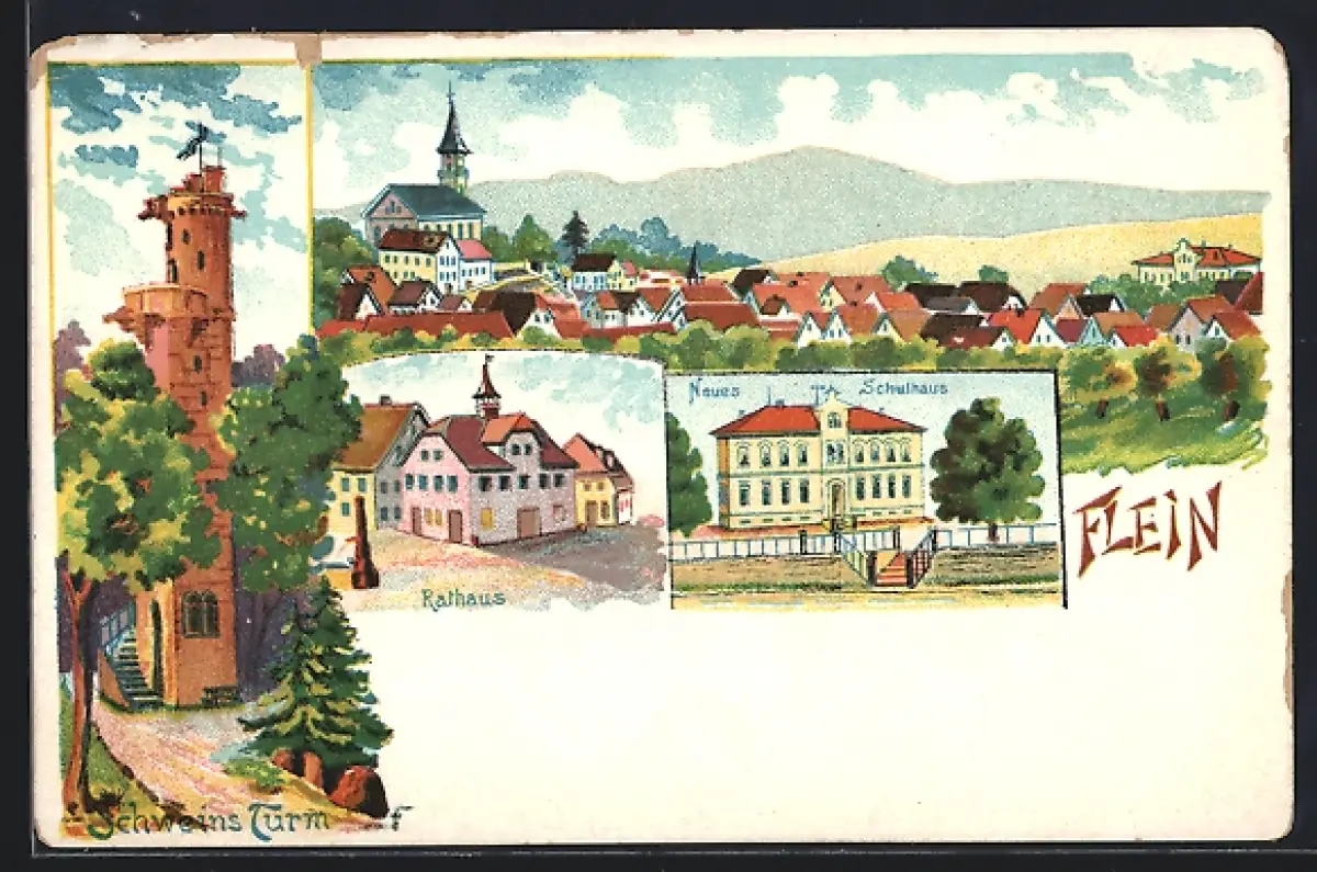 Lithographie Flein / Neckar, Rathaus, Schweins Turm und Ortsansicht