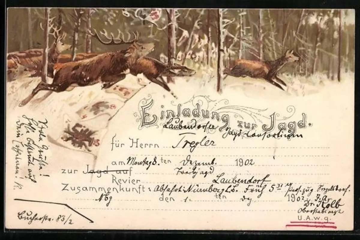 Lithographie Fliehende Rehe im Schnee, Jagdeinladung
