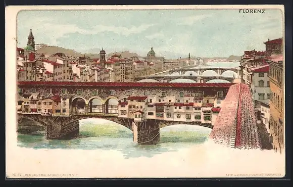 Lithographie Florenz, Teilansicht mit Brücke