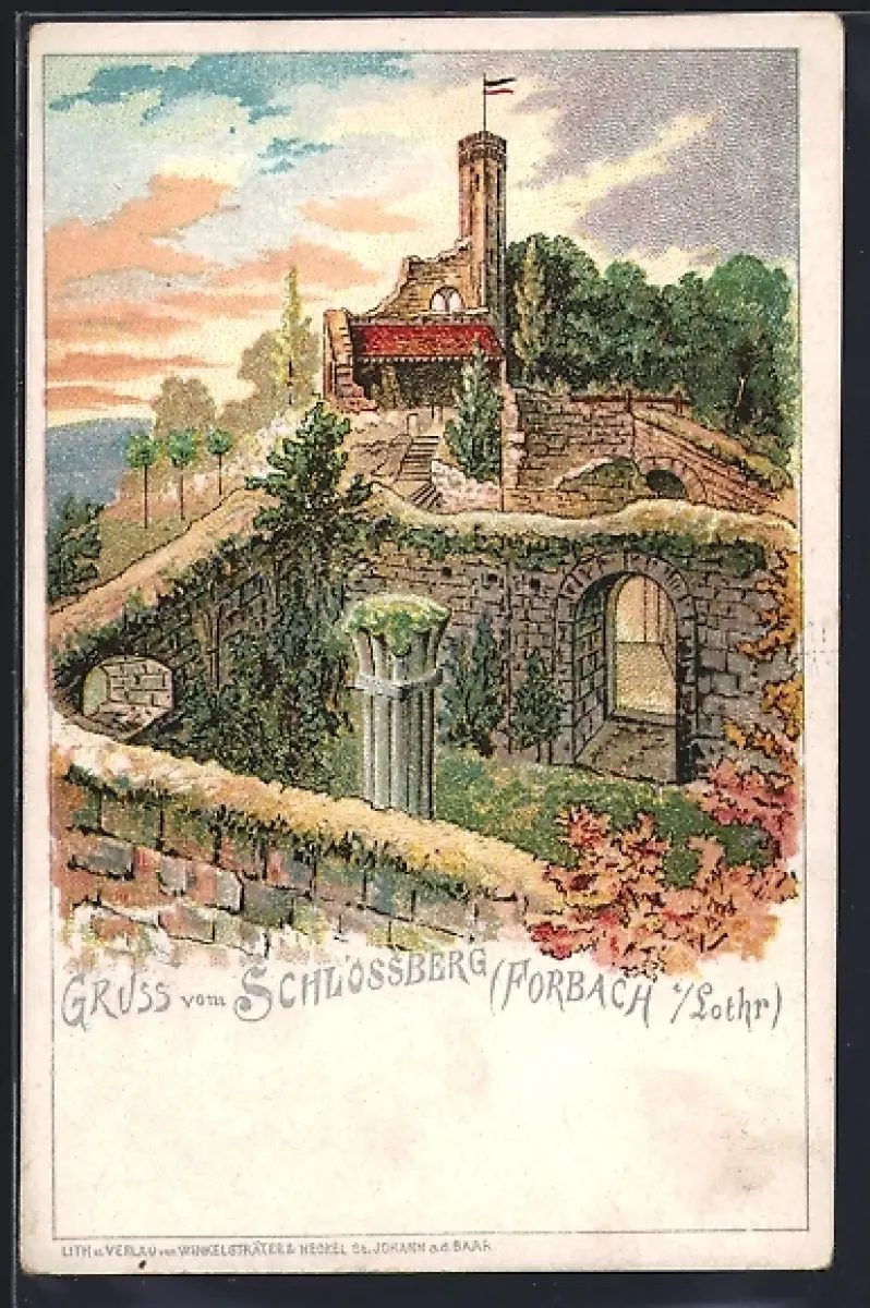 Lithographie Forbach /Lothr., Ruine auf dem Schlossberg