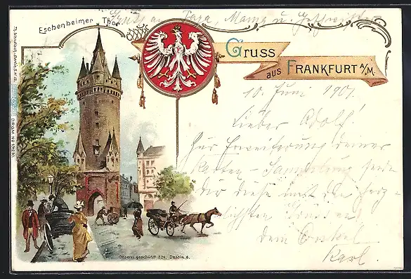 Lithographie Frankfurt /Main, Strassenleben und Pferdekutschen am Eschenheimer Thor, Siegel