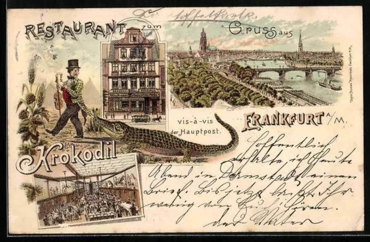 Lithographie Frankfurt, Ortsansicht, Restaurant Krokodil vis-à-vis der Hauptpost, Zeil 45