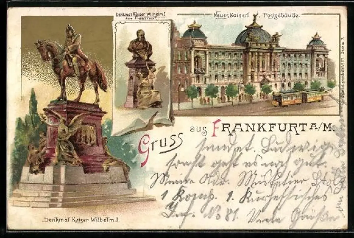 Lithographie Frankfurt a. M., Denkmal Kaiser Wilhelm I, Neues Kaiserl. Postgebäude mit Strassenbahn