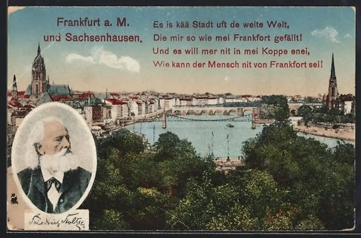 Lithographie Frankfurt a. M., Mainufer, Brücke, Kaiserdom, Porträt Friedrich Stoltze