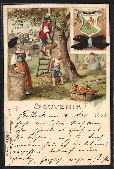 Lithographie Frauenfeld, Reklame f. Suchard Schokolade, Familie bei der Apfelernte