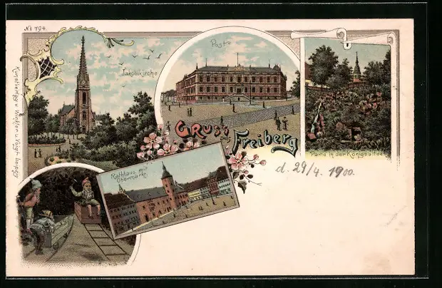 Lithographie Freiberg, Post, Jakobikirche, Rathaus mit Obermarkt