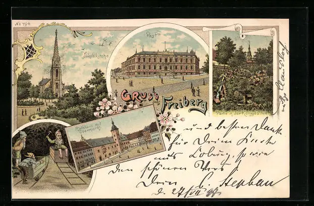 Lithographie Freiberg, Post, Rathaus mit Obermarkt, Königsallee
