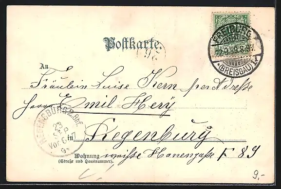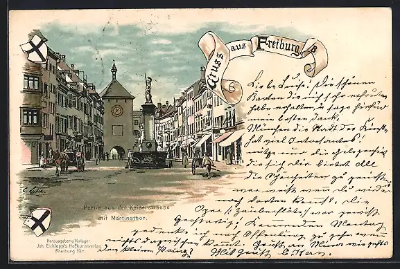 Lithographie Freiburg i. B., Kaiserstrasse mit Martinsthor