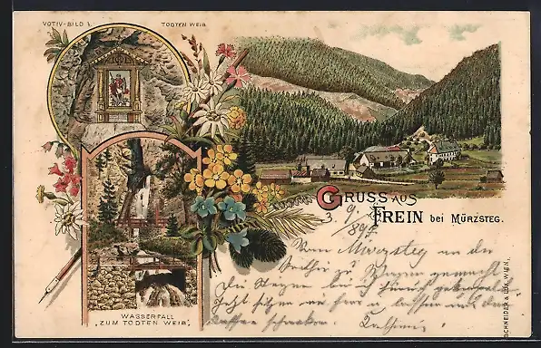 Lithographie Frein b. Mürzsteg, Wasserfall zum todten Weib, Totalansicht