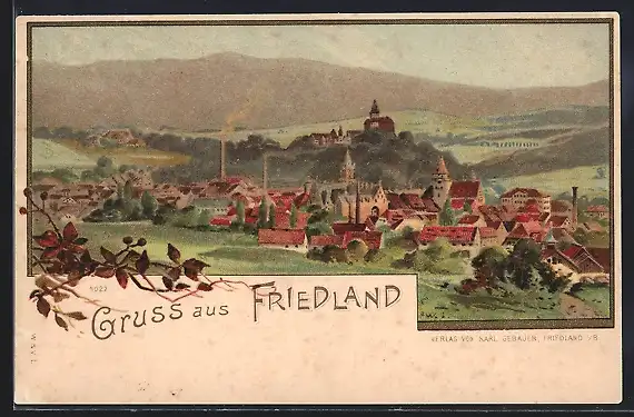 Lithographie Friedland, Ortsansicht aus der Vogelschau