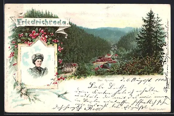 Lithographie Friedrichroda, Der Grund, Frau in Tracht
