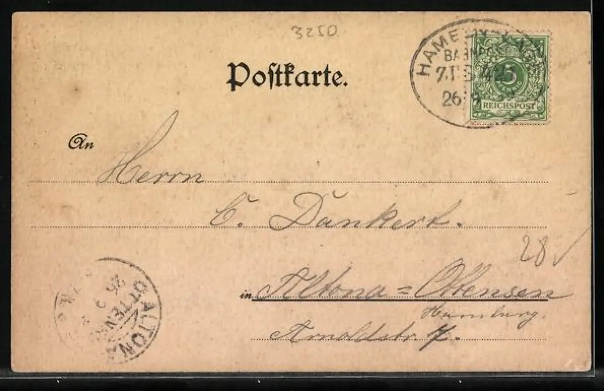 Personenbezogene Daten auf der Rückseite der Karte wurden durch blauen Textmarker unkenntlich gemacht. Die blauen Stellen sind auf die Vorderseite durchgeweicht und wirken sich negativ auf das Postkartenfoto aus