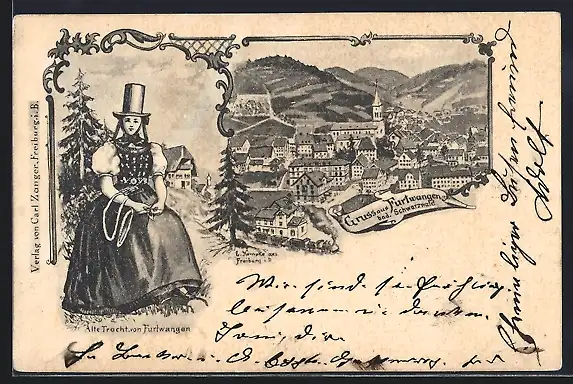 Lithographie Furtwangen, Totalansicht, Furtwänglerin in Tracht