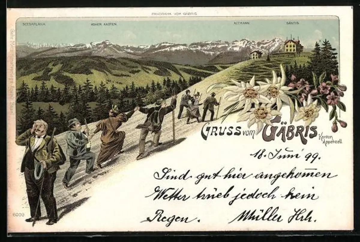 Lithographie Gäbris, Bergsteiger erklimmen den Gipfel, Alpenpanorama