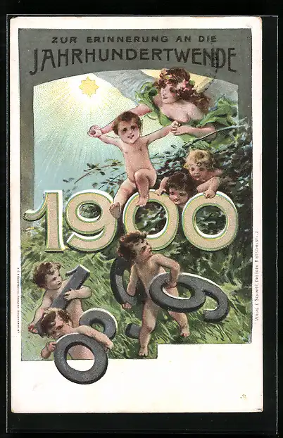 Lithographie Ganzsache PP8C4: Zur Erinnerung an die Jahrhundertwende, Putten mit Jahreszahl 1900