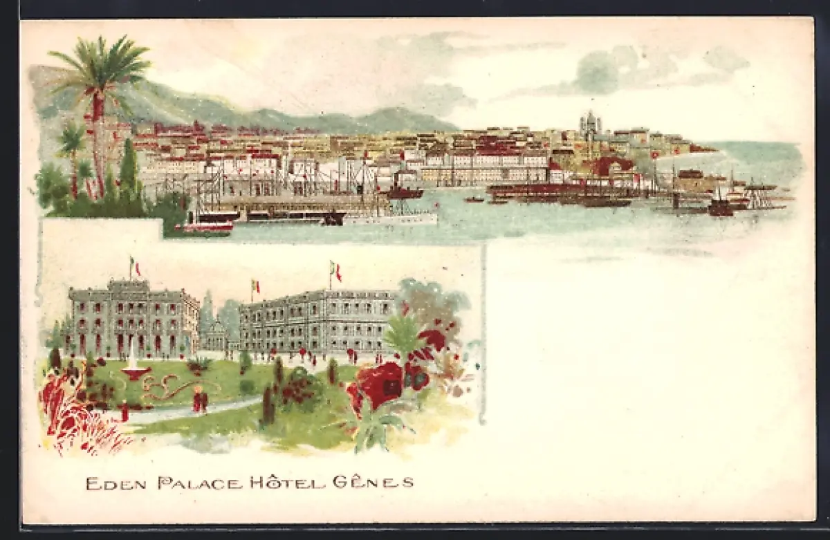 Lithographie Genes, Eden Palace Hotel, Blick über den Hafen auf die Stadt