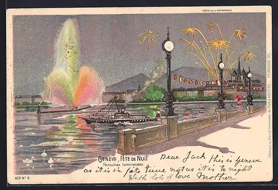 Lithographie Genève, Fête du Nuit, Fontaines lumineuses