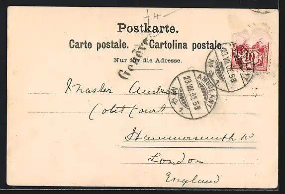 gelaufen 1902, Briefmarke entfernt, Eckknicke re. oben u. li., guter Zustand