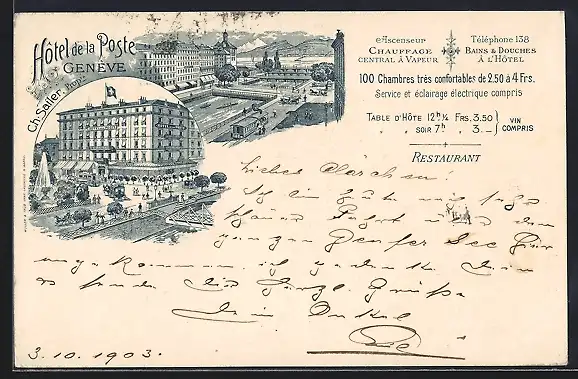 Lithographie Genève, Hotel de la Poste, Ch. Sailer