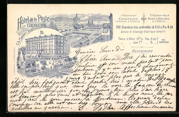 Lithographie Geneve, Hotel de la Poste, Ch. Sailer, Propre.