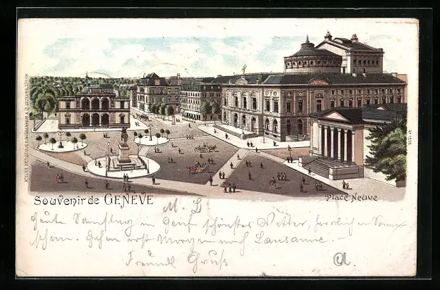 Lithographie Geneve, Place Neuve, Gebäudeansicht und Denkmal