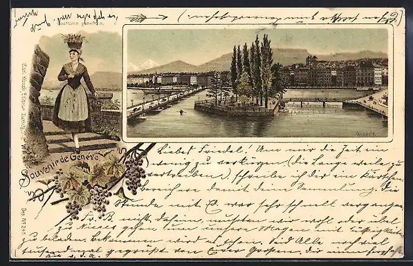 Lithographie Geneve, Schweizerin in Tracht, Ortsansicht