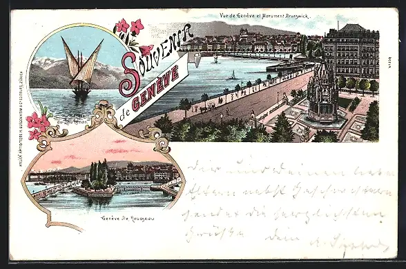 Lithographie Genève, Vue de Genève et Monument Brunswick, Lac Léman, Ile Rousseau