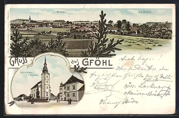 Lithographie Gföhl, Ortsansicht aus der Vogelschau, Partie am Kirchenplatz