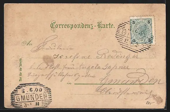 gelaufen 1900, Eckknicke oben, Ecken bestoßen, guter Zustand