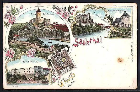 Lithographie Giebichenstein, Kirche, Dom von der Saaleseite, Ruine Moritzburg im Saalethal