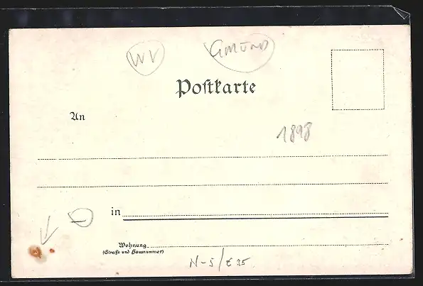 Personenbezogene Daten auf der Rückseite der Karte wurden durch blauen Textmarker unkenntlich gemacht. Die blauen Stellen sind auf die Vorderseite durchgeweicht und wirken sich negativ auf das Postkartenfoto aus