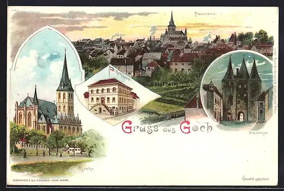 Lithographie Goch, Steinthor, Rathaus, Kirche