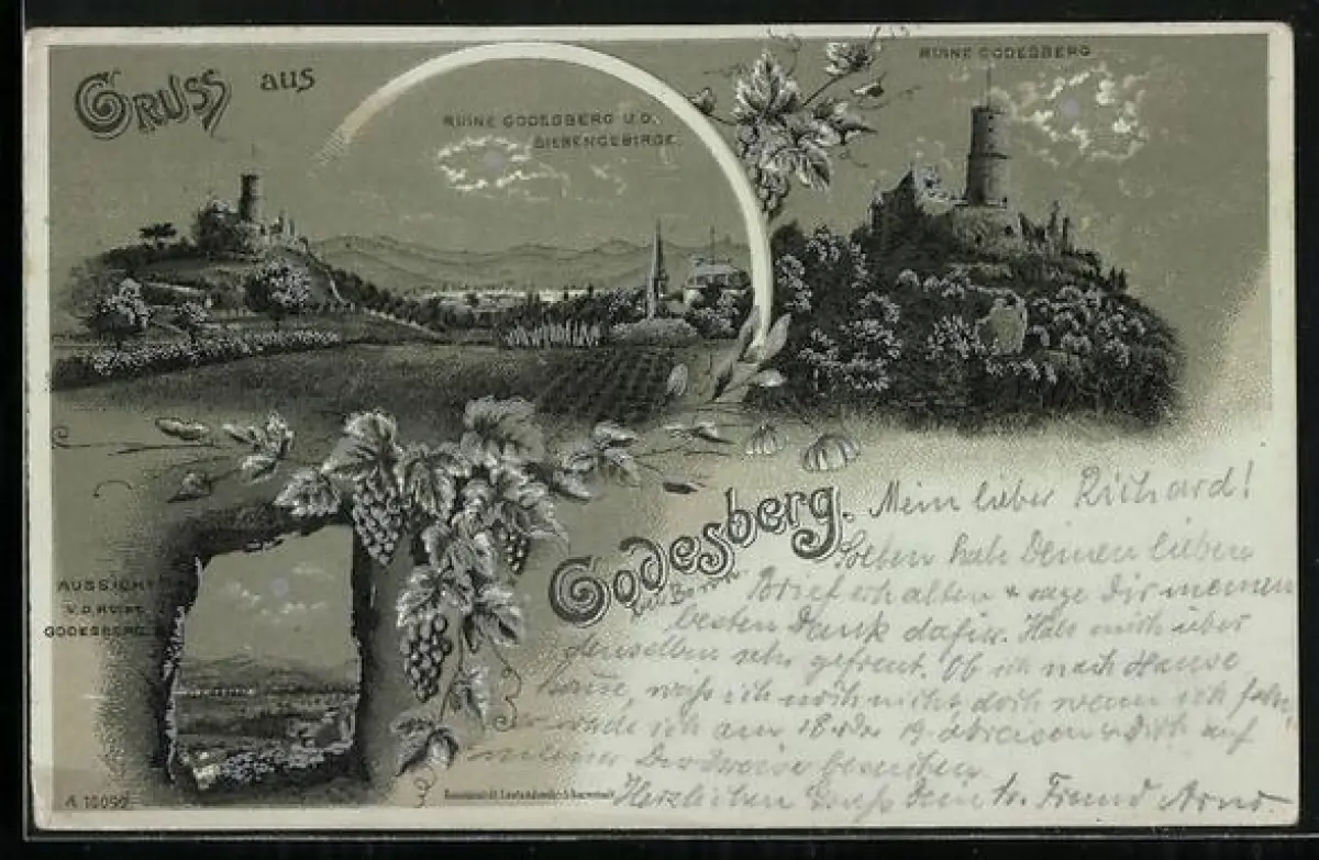 Lithographie Godesberg, Ruine und Siebengebirge, Aussicht v. d. Ruine