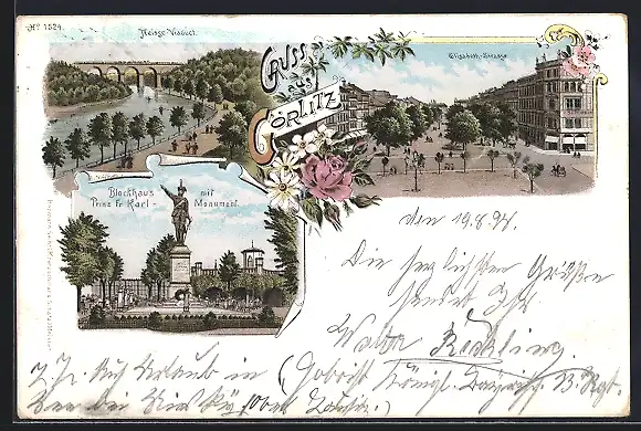 Lithographie Görlitz, Neisse-Viaduct, Elisabeth-Strasse, Blockhaus mit Prinz Fr. Karl Monument