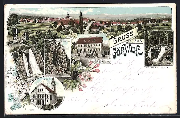 Lithographie Görwihl, Gasthaus zum Deutschen Kaiser, Kirche, Höllbach